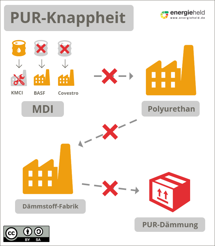 Mit diesem MDI- / TDI-Mangel musste auch die Herstellung von PUR und PIR bei BASF und Covestro zurückgefahren werden. Dazu kam noch, dass Huntsman, ein weiterer PUR- / PIR-Hersteller, sein niederländisches Werk aufgrund technischer Probleme geschlossen halten musste.